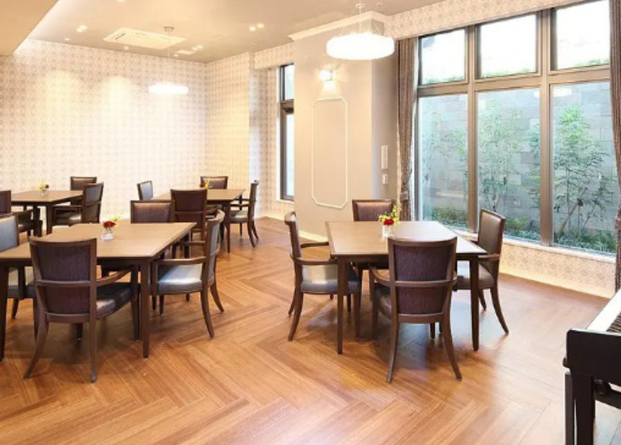 ダイニングルーム兼機能訓練室、ティールーム、ビューティサロン(各種の外部サービス〔利用者実費負担〕を受けるための部屋)、ファミリールーム、健康管理室兼事務室、洗濯コーナー、浴室